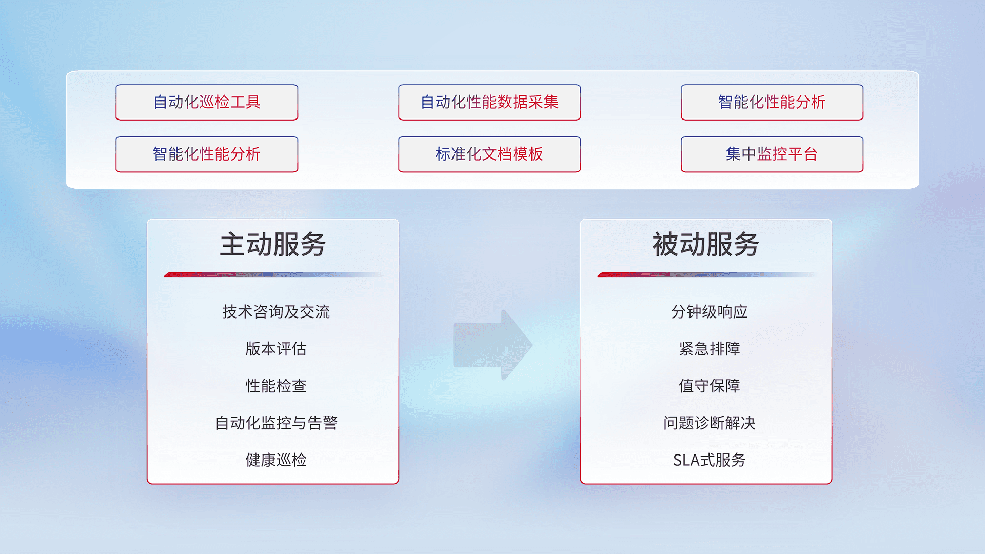 智能化工具和标准化文档,,保障服务质量,,,提供主动服务(包含技术咨询、、版本评估、、性能检查、、、、自动化监控与告警、、健康巡检)和被动服务包含(分钟级响应、、、、紧急排障、、、值守保障、、问题诊断解决、、SLA服务)。。。。